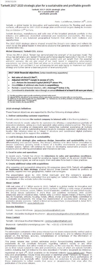 得嘉2017-2020年可持續(xù)及盈利發(fā)展戰(zhàn)略計(jì)劃 得嘉集團(tuán)是一家提供創(chuàng)新及可持續(xù)發(fā)展解決方案地板及運(yùn)動(dòng)地面的全球領(lǐng)導(dǎo)者, 2016年10月27日得嘉集團(tuán)將在投資者日在巴黎發(fā)布其2017 - 2020年戰(zhàn)略計(jì)劃和財(cái)務(wù)目標(biāo)。